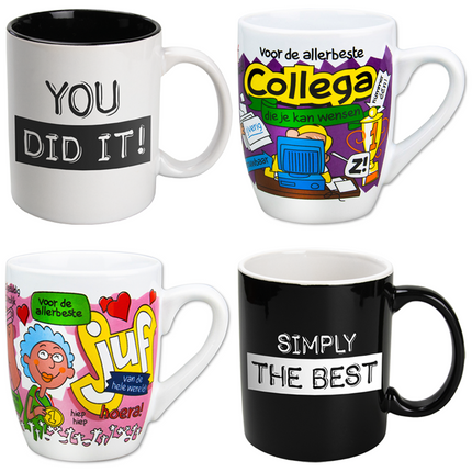 Mokken: met opties zoals cartoon prints of inspirerende teksten, deze mokken zijn zowel praktisch als persoonlijk. Ze zijn een populaire keuze voor zowel persoonlijke geschenken als voor zakelijke gelegenheden.