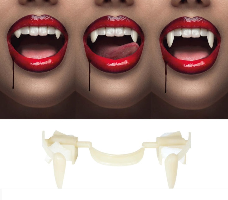 Vampier nep tanden: deze set bevat een volledige rij nep tanden die een authentieke vampieruitstraling geven. De tanden zijn ontworpen om comfortabel over je eigen tanden te passen, waardoor ze ideaal zijn voor langdurig dragen tijdens feesten.