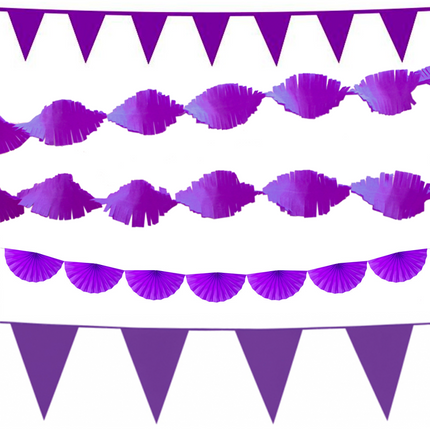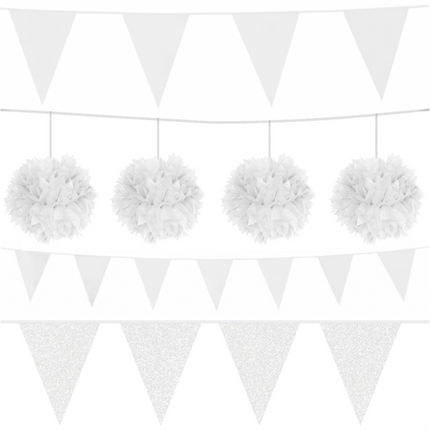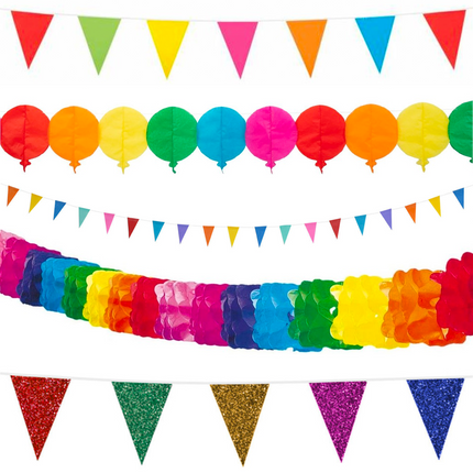 Mocht je juist zin hebben in een lekker kleurig feest met alles door elkaar? Dan kan dat natuurlijk ook. Door de vele vormen die wij in ons assortiment verkopen, kan je het zo gek maken als je wilt. Zo hebben wij bijvoorbeeld knoopballonnen, glitterslingers, franjeslingers en hangversiering van crêpe.