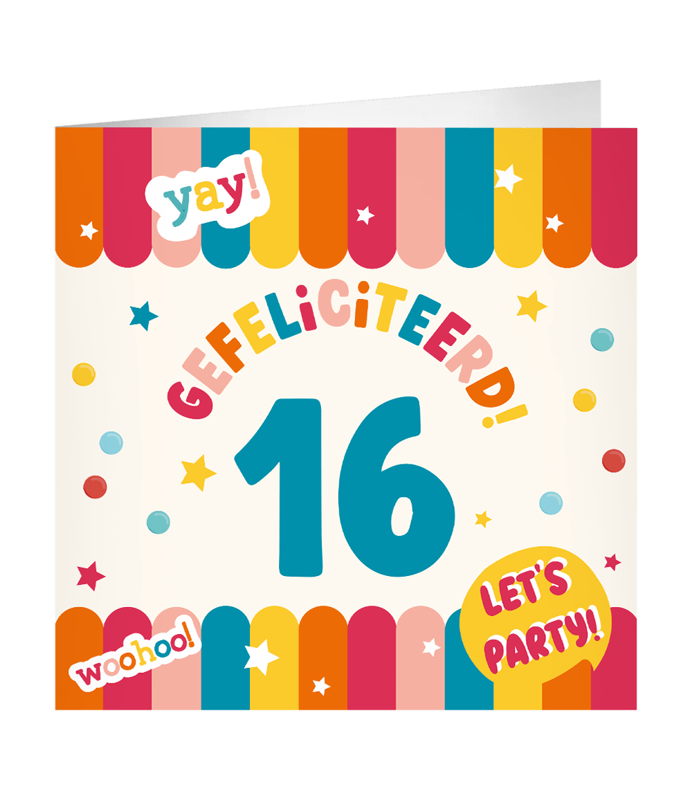 Materiaal: papierXL Greeting cards - 16 jaar is de perfecte kaart om te versturen als er iemand 16 wordt. Niet alleen het leuke design zal opvallen bij de ontvanger, ook de grote afmeting van ongeveer 23 x 23 centimeter is gewoon niet te missen!