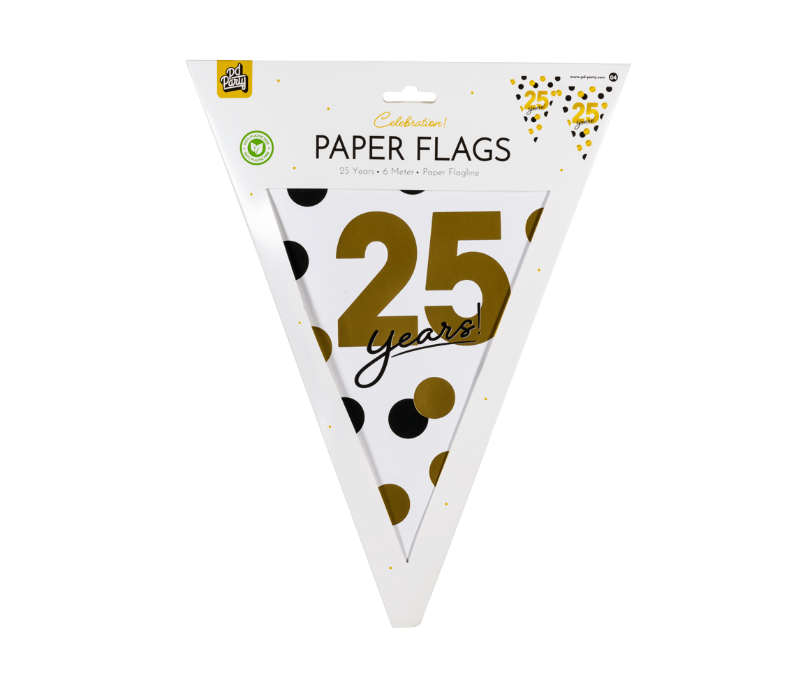 De Celebration! paper flags - 25 zijn de perfecte vlaggetjes om een feestje voor een 25-jarige op te leuken! Deze vlaggenlijn valt op door zijn onderscheidende design en omdat de vlaggetjes gemaakt zijn van papier denk je ook nog eens aan het milieu! De paper flags zijn 6 meter lang. Combineer ze met de bijpassende celebration! balloons!