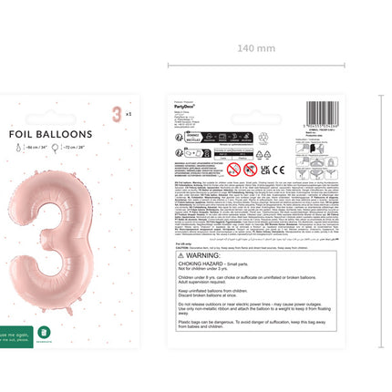 3 Jaar Cijfer Ballon Lichtroze Leeg 72cm