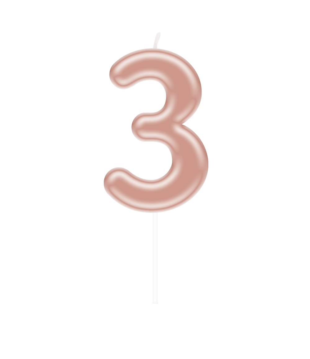Vier elke mijlpaal stijlvol met deze roségouden cijferkaars “3”. Perfect voor het aangeven van leeftijden, jubileumgetallen of andere speciale gelegenheden. De glanzende roségouden kleur zorgt ervoor dat de kaars extra opvalt op elke taart of cupcake.