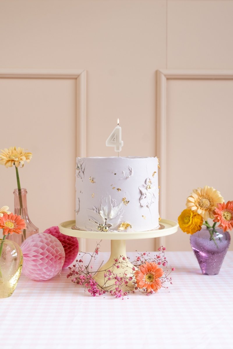 Verjaardagskaars Nummer 4 in beige, Hoogte kaars ca. 6 cm, hoogte kaars met stok ca. 10 cm.