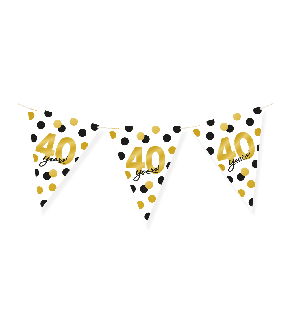 De Celebration! paper flags - 40 zijn de perfecte vlaggetjes om een feestje voor een 40-jarige op te leuken! Deze vlaggenlijn valt op door zijn onderscheidende design en omdat de vlaggetjes gemaakt zijn van papier denk je ook nog eens aan het milieu! De paper flags zijn 6 meter lang. Combineer ze met de bijpassende celebration! balloons!