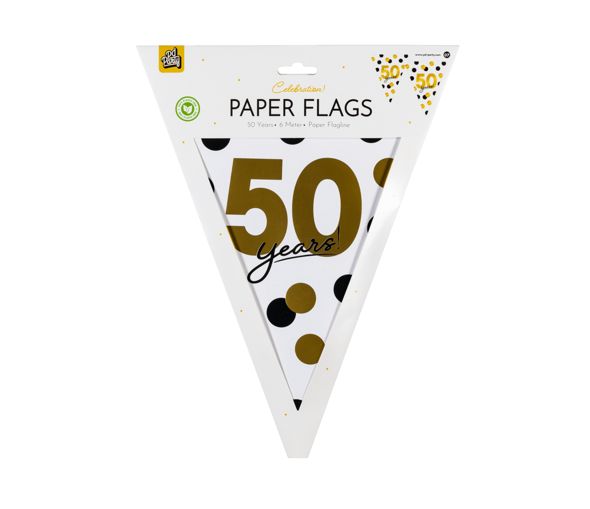 De Celebration! paper flags - 50 zijn de perfecte vlaggetjes om een feestje voor een 50-jarige op te leuken! Deze vlaggenlijn valt op door zijn onderscheidende design en omdat de vlaggetjes gemaakt zijn van papier denk je ook nog eens aan het milieu! De paper flags zijn 6 meter lang. Combineer ze met de bijpassende celebration! balloons!