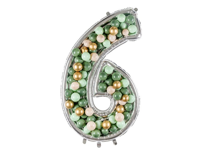 Cijfer '6' frame, ca. 126 cm groot voor latex ballonnen. Een nieuwe trend in verjaardags- en jubileumfeestdecoratie. Een doe-het-zelfproduct voor zelfmontage en luchtvulling. Frame in zilverkleur.