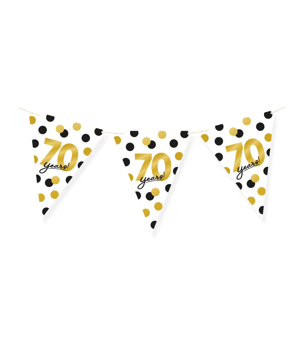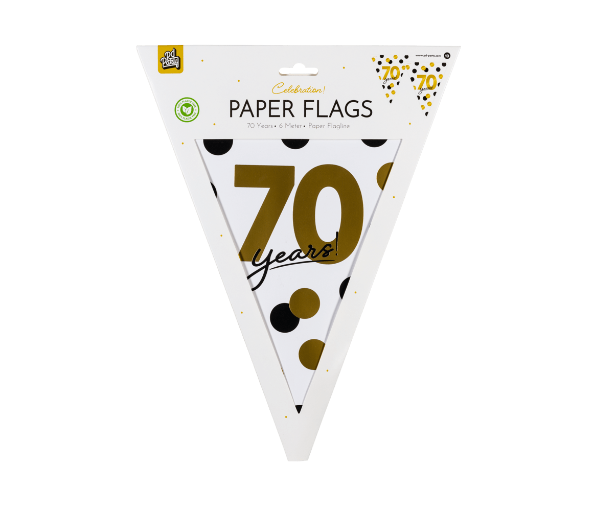 De Celebration! paper flags - 70 zijn de perfecte vlaggetjes om een feestje voor een 70-jarige op te leuken! Deze vlaggenlijn valt op door zijn onderscheidende design en omdat de vlaggetjes gemaakt zijn van papier denk je ook nog eens aan het milieu! De paper flags zijn 6 meter lang. Combineer ze met de bijpassende celebration! balloons!
