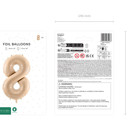Pastelfolie ballon nummer “8” in beige kleur, afmeting voor opblazen ongeveer 86 cm (34''), afmeting na opblazen ongeveer 72 cm (28''). Voor het opblazen met lucht en helium. De set bevat een rietje.