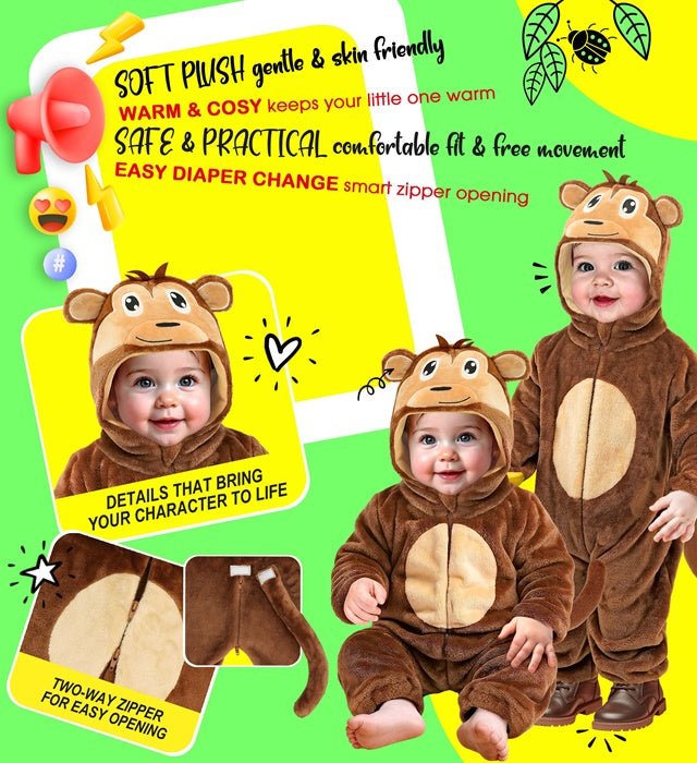 Ga op avontuur met dit vrolijke aap kostuum van zacht pluche fluweel. Het comfortabele materiaal en het speelse ontwerp maken dit kostuum perfect voor kinderen die dol zijn op verkleden.