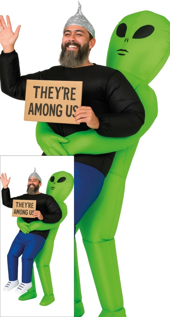 Val op op elk feest met dit hilarische Carry Me kostuum waarin het lijkt alsof een alien jou meedraagt! Dankzij de ingebouwde ventilator blaast het kostuum zichzelf eenvoudig op en blijft het de hele avond in vorm. Perfect voor themafeesten, carnaval of festivals.
