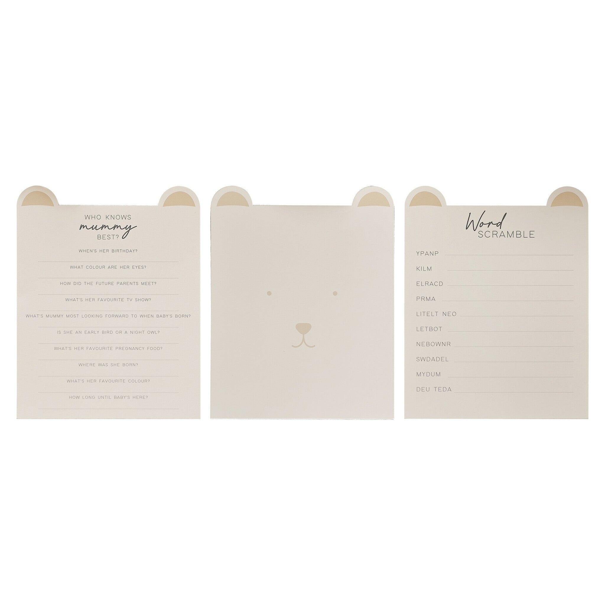 Elk pakket bevat 2 spellen: 'Word Scramble' en 'Who Knows Mummy Best' babyshowerquiz, met elk 10 kaarten.