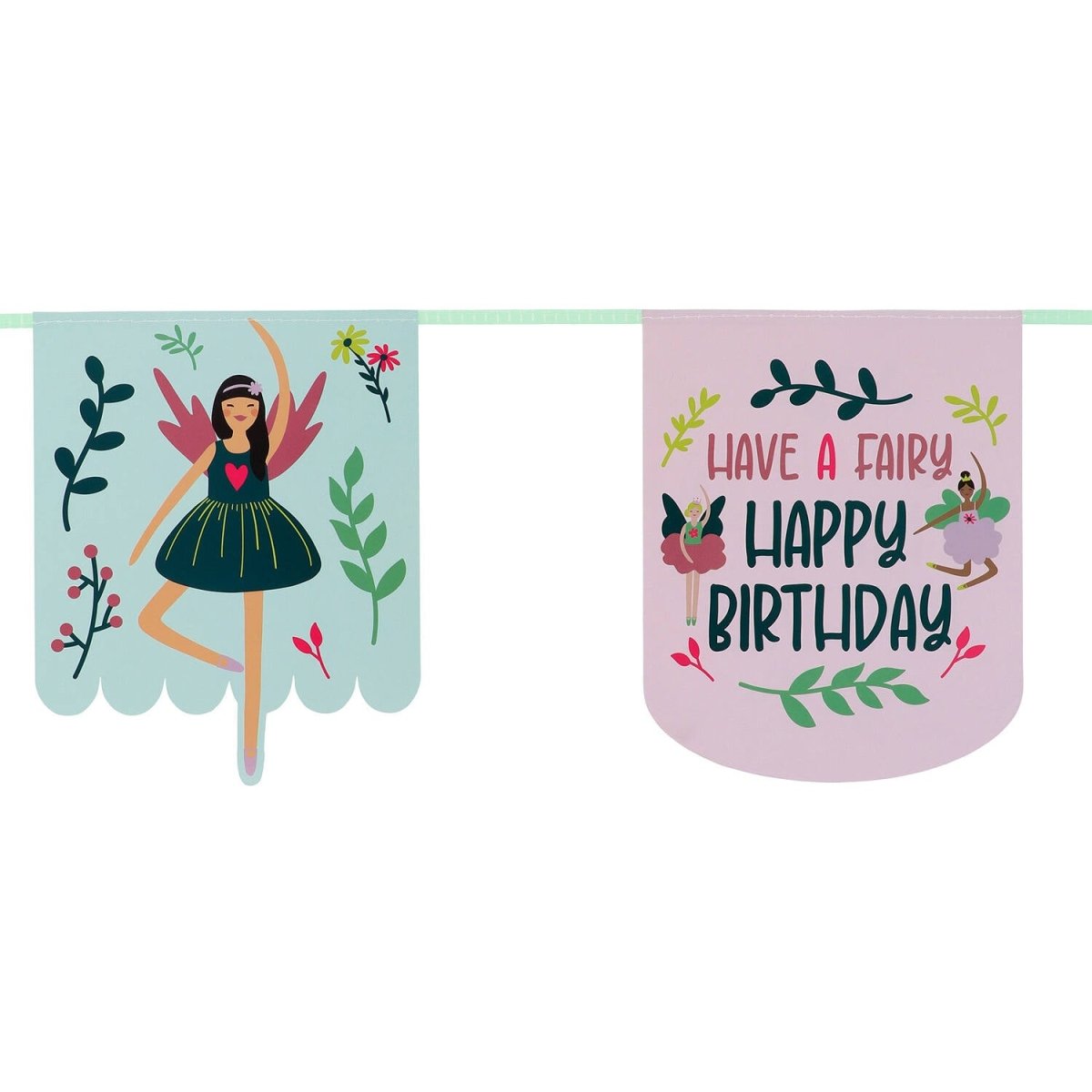 Het is feeën-feest! Vlaggenlijn - Fabulous Fairy - 6 meter. Inhoud: 1 vlaggenlijn. Bijvoorbeeld te gebruiken tijdens de volgende feestgelegenheid/feestgelegenheden: Kinderfeestje, Verjaardag. Er zitten 16 vlaggen van ongeveer 17 x 21 cm groot op deze 6 meter lange vlaggenlijn. Er zijn 3 soorten vlaggen: een licht turquoise vlag met schulprand met daarop een fee met oranje haar en groene blaadjes eromheen, eenzelfde vlag maar dan met een fee met bruin haar erop, en een zachtroze vlag met afgeronde hoeken en daarop de tekst "HAVE A FAIRY HAPPY BIRTH DAY" en eromheen feeën en groene blaadjes. De vlaggen zijn dubbelzijdig bedrukt. Deze vlaggenlijn hoort bij de Fabulous Fairy collectie van Folat. Dit artikel is gemaakt van papier.