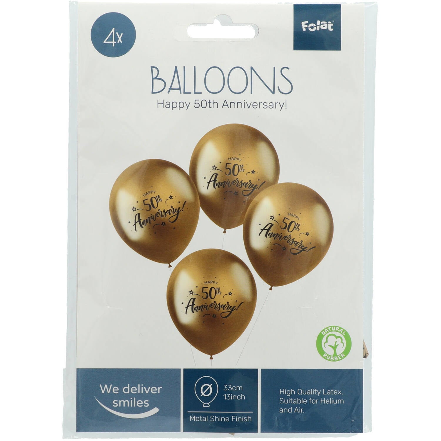 Ballonnen Shimmer 50th Anniversary 33cm - 4 stuks. Inhoud: 4 latex ballonnen. Kleur: Goudkleurig. Bijvoorbeeld te gebruiken tijdens de volgende feestgelegenheid/feestgelegenheden: Jubileum. Elke ballon is 13 inch/33 cm. Het artikel is gemaakt van latex.