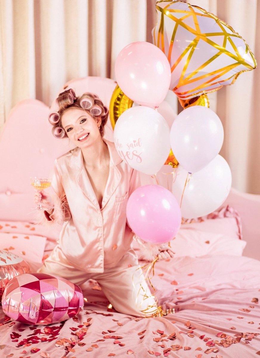 Set Ringballonnen, de set bestaat uit 6 ballonnen (Sterke ballonnen: 1 in Pastel Pale Pink, 1 in Pastel Baby Pink, 1 in Pastel Light Lilac, 2 in Pastel White met een roze print, 1 folieballon in de vorm van een Ring ). Diameter latexballonnen ca. 30 cm, afmetingen van een folieballon voor het opblazen ca. 60 x 95 cm (24 x 37,5''), afmetingen na het opblazen ca. 56 x 75 cm (22 x 29,5''). Op te blazen met lucht en helium. De set is inclusief een rietje.