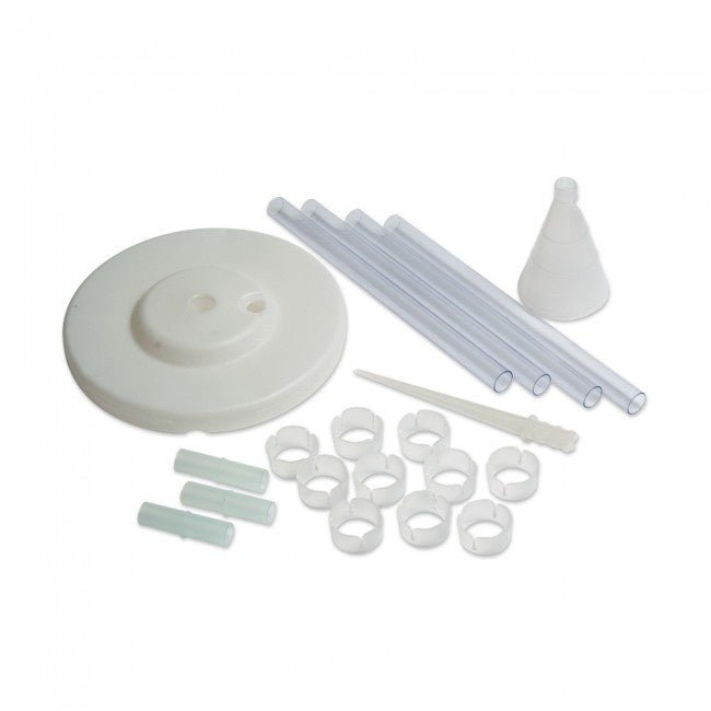 Inhoud: 4 buizen, 3 koppelstukken, 10 ballonringen, houder reuze ballon, ronden voetstandaard (te vullen met water), pin standaard (voor in het gras of zand)