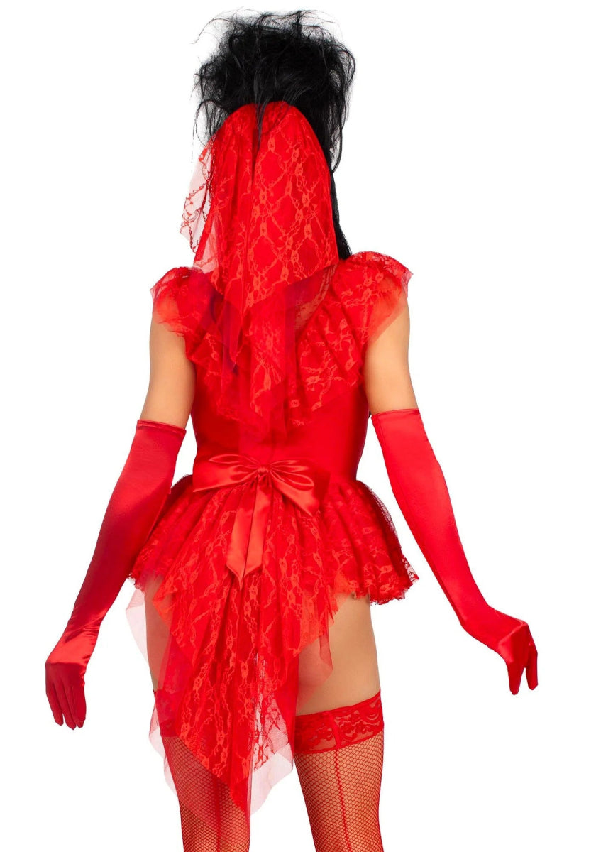 Transformeer jezelf in een verleidelijke versie van Lydia Deetz uit Beetlejuice met dit opvallende Beetle Babe kostuum! Deze Halloween-outfit bestaat uit een kanten ruffle-garterbody, een pin-on bustle-strik en een bijpassende rode sluier voor een onmiskenbare bruidslook met een macabere twist. Combineer het met handschoenen tot aan de elleboog en kousen tot aan de dijen (niet inbegrepen) om je look nog sexier en griezeliger te maken! 👻💋