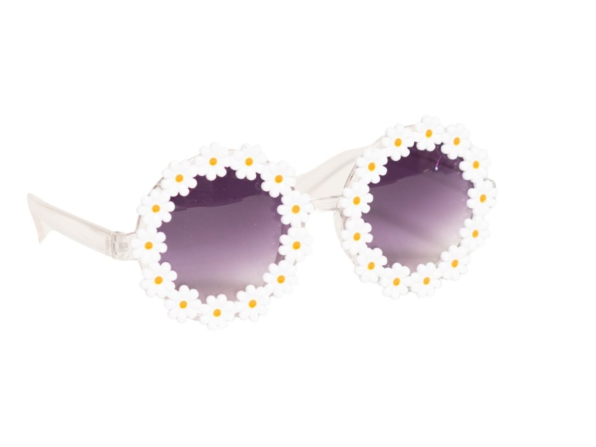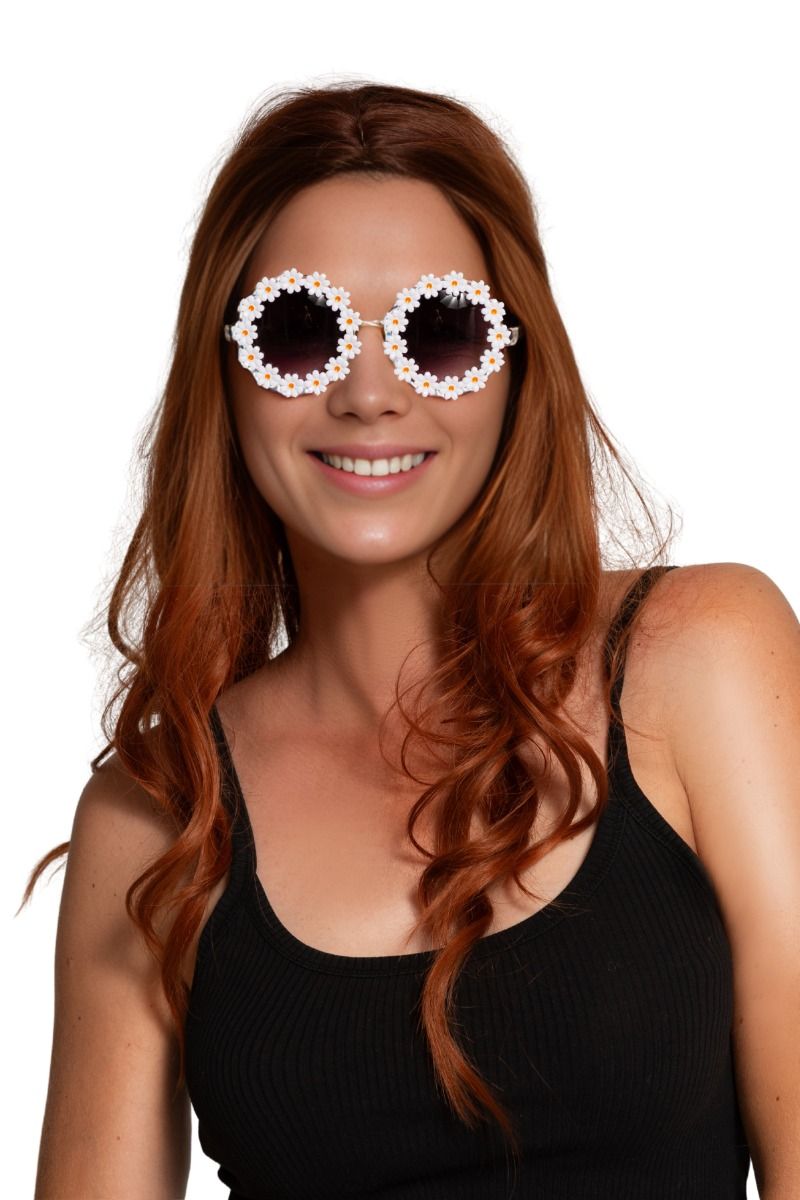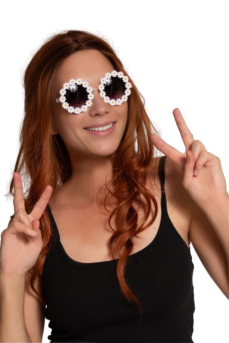 Deze bril met witte bloemen is een vrolijk hippie accessoire en perfect voor carnaval, themafeesten en verkleedpartijen. Ideaal om een flower power-outfit compleet te maken.