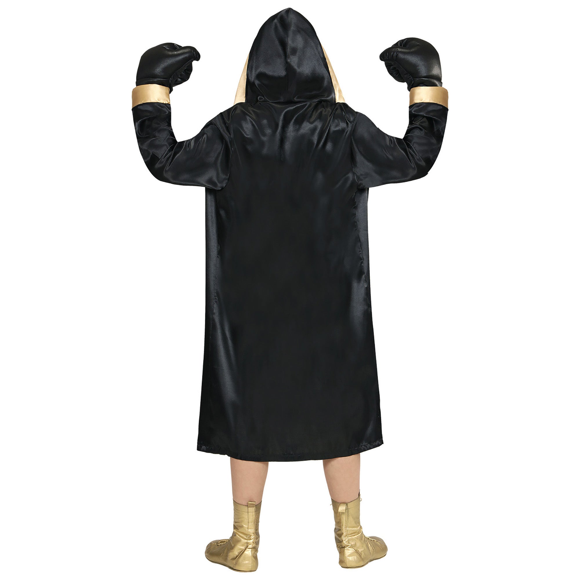 Omschrijving: wereldkampioen boksen met capuchon, korte broek, riem, bokshandschoenen