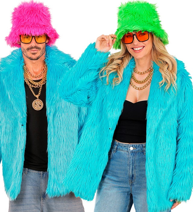 Deze pluche bontjas in turquoise is een frisse en opvallende eyecatcher, perfect voor een feestelijke en kleurrijke outfit. Ideaal voor Carnaval, themafeesten, jaren 80/90-feesten of een foute party.