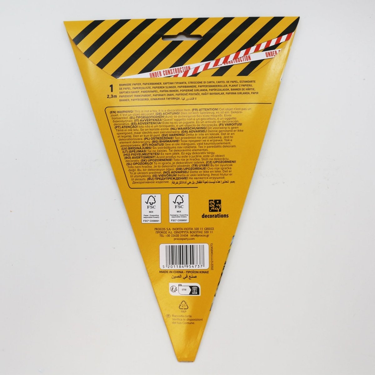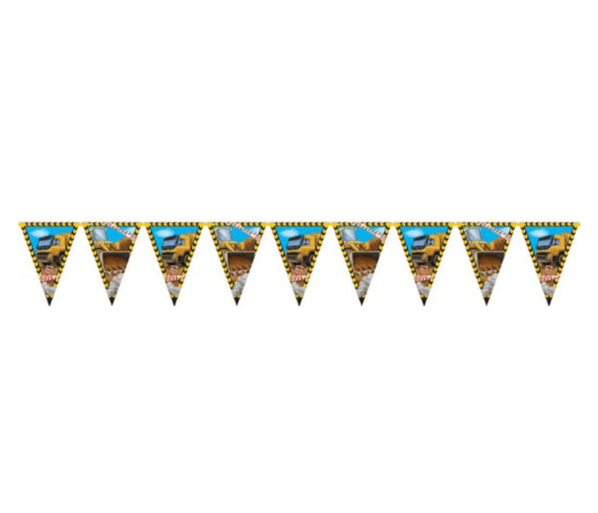 Deze bouwthema vlaggenlijn is perfect om een feestje om te toveren tot een echte bouwplaats. De vrolijke bouwvoertuigen en felle kleuren maken de slinger ideaal voor kinderfeestjes en themafeestjes. Met een lengte van 2,3 meter en 9 stevige papieren vlaggen is dit een opvallende én sfeervolle decoratie.