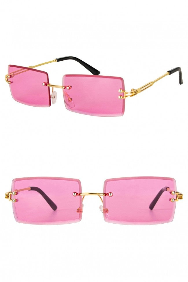 Maak je klaar om te stralen tijdens jouw favoriete feestje en maak jouw festival outfit helemaal af met deze leuke rechthoekige zonnebril met roze lenzen! De bril bevat roze kunststof glazen en heeft een volledig randloos montuur, wat het een elegant en modern tintje geeft. Met zijn rechthoekige vorm en goud met zwart frame val jij gegarandeerd op tussen de feestvierders. Deze zonnebril voegt een vleugje stijl toe aan elke outfit. Met deze trendy rechthoekige zonnebril met roze glazen ben jij helemaal klaar om los te gaan op jouw favoriete feestjes