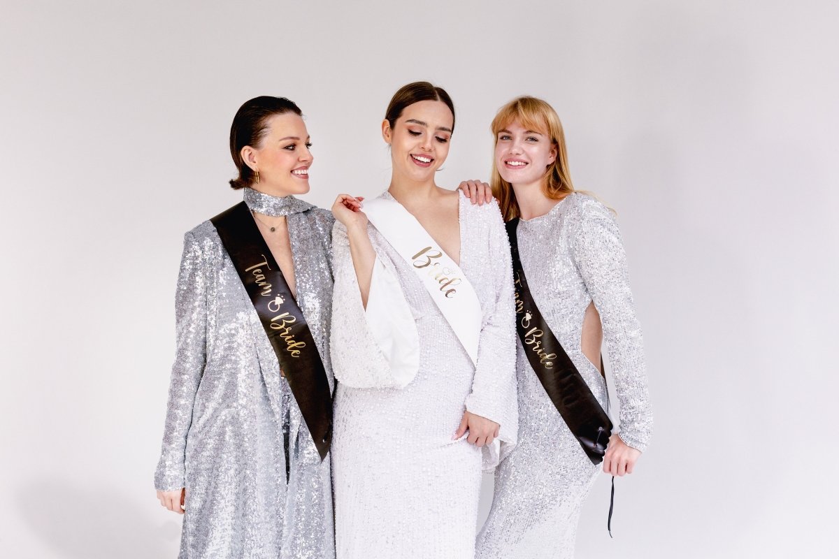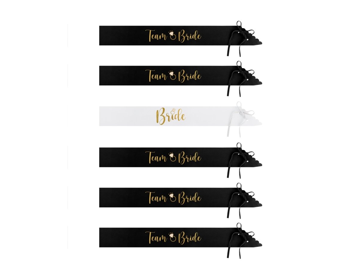 Set van satijnen sjerpen. 1 stuk Bride to be in wit met metallic goud opdruk, 5 stukken Team Bride sjerpen in zwart met metallic goud opdruk, breedte ca. 10 cm, lengte ca. 75 cm.