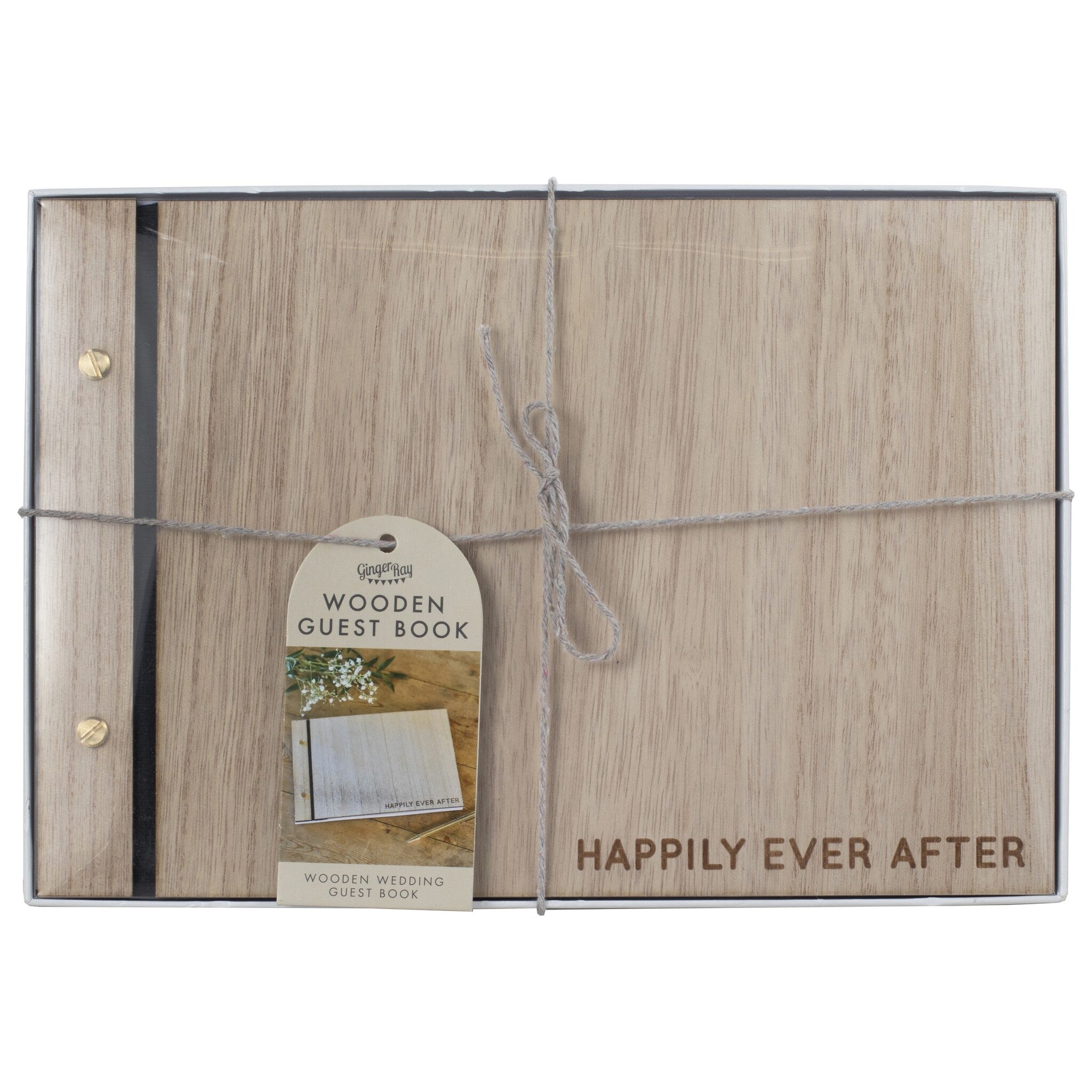 1 x 'Happil Ever After' houten bruiloftsgastenboek met 32 ​​pagina's, afmeting 18 cm (H) x 26 cm (B)