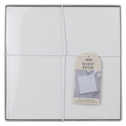 Met 'Gastenboek' in reliëf op de voorkant, 'Mr & Mrs' in goud op de rug, pagina's met gouden randen en een bladwijzer met wit lint, voegt dit bruiloftsgastenboek een luxueus tintje toe aan elke moderne bruiloft.