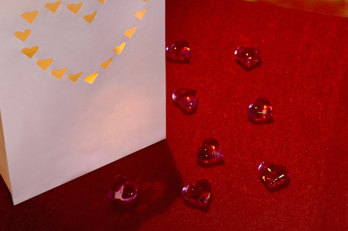 Inhoud: Lantaarns voor kaarsen, in de vorm van zakken, wit, met een hart motief, grootte 15x9x26 centimeter. Gemaakt van niet-brandbaar papier. (1 pkt / 10 pct.)
