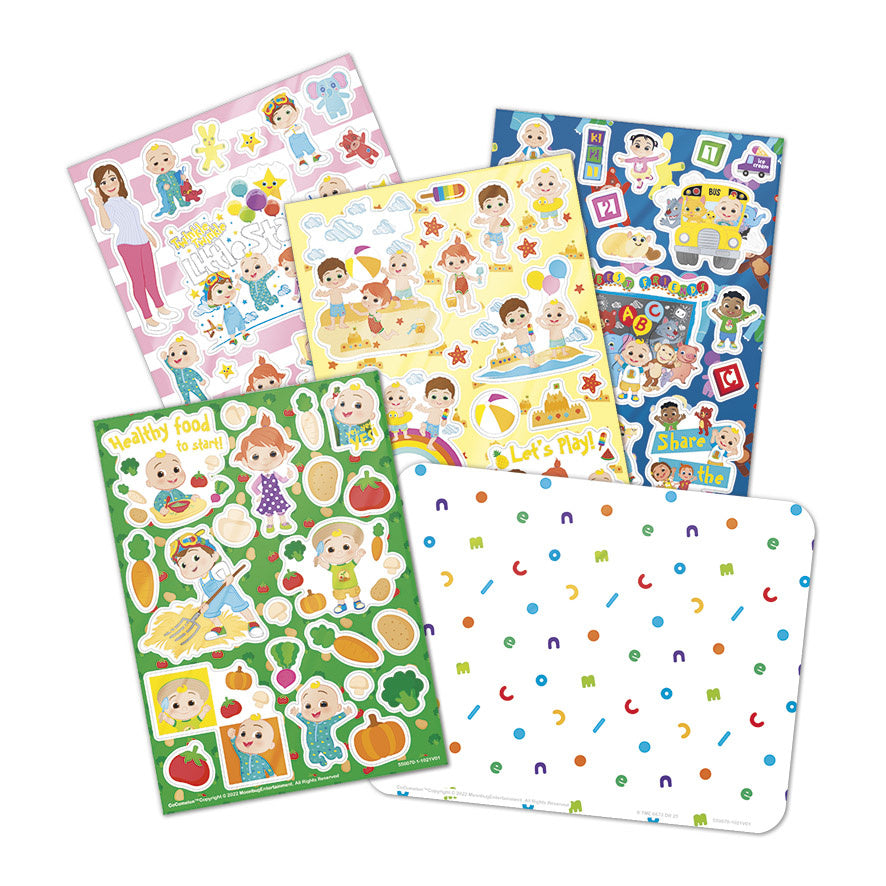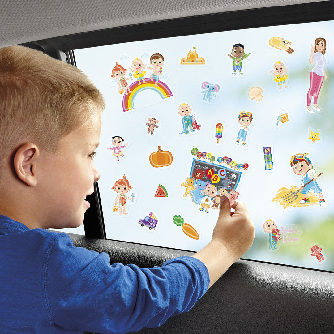 Met deze CoComelon raamstickers is verveling geen optie. Gebruik ze in de auto, in huis op de ramen, tegels of spiegels of maak eigen avonturen door de stickers te gebruiken op de meegeleverd achtergrond plakkaart. De raamstickers werken zonder gebruik van lijm en kunnen telkens opnieuw op een gladde ondergrond worden gebruikt. Deze set bestaat uit 4 velletjes raamstickers in verschillende thema’s zoals eten, strand, bedtijd en school en 1 voorbedrukte achtergrond om te beplakken.