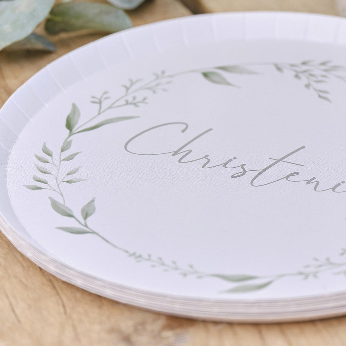 Geef je doopservies een botanische sfeer met deze prachtige papieren borden.
