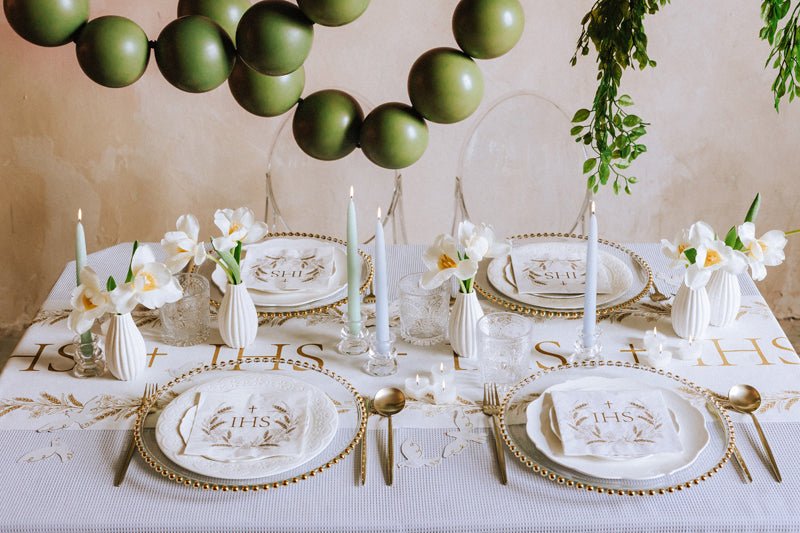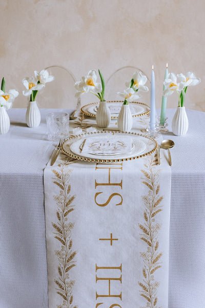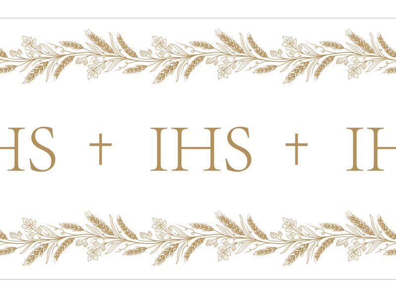 Communietafelloper van nonwoven stof, in wit met goudopdruk. Breedte ca. 40 cm, lengte ca. 5 m.
