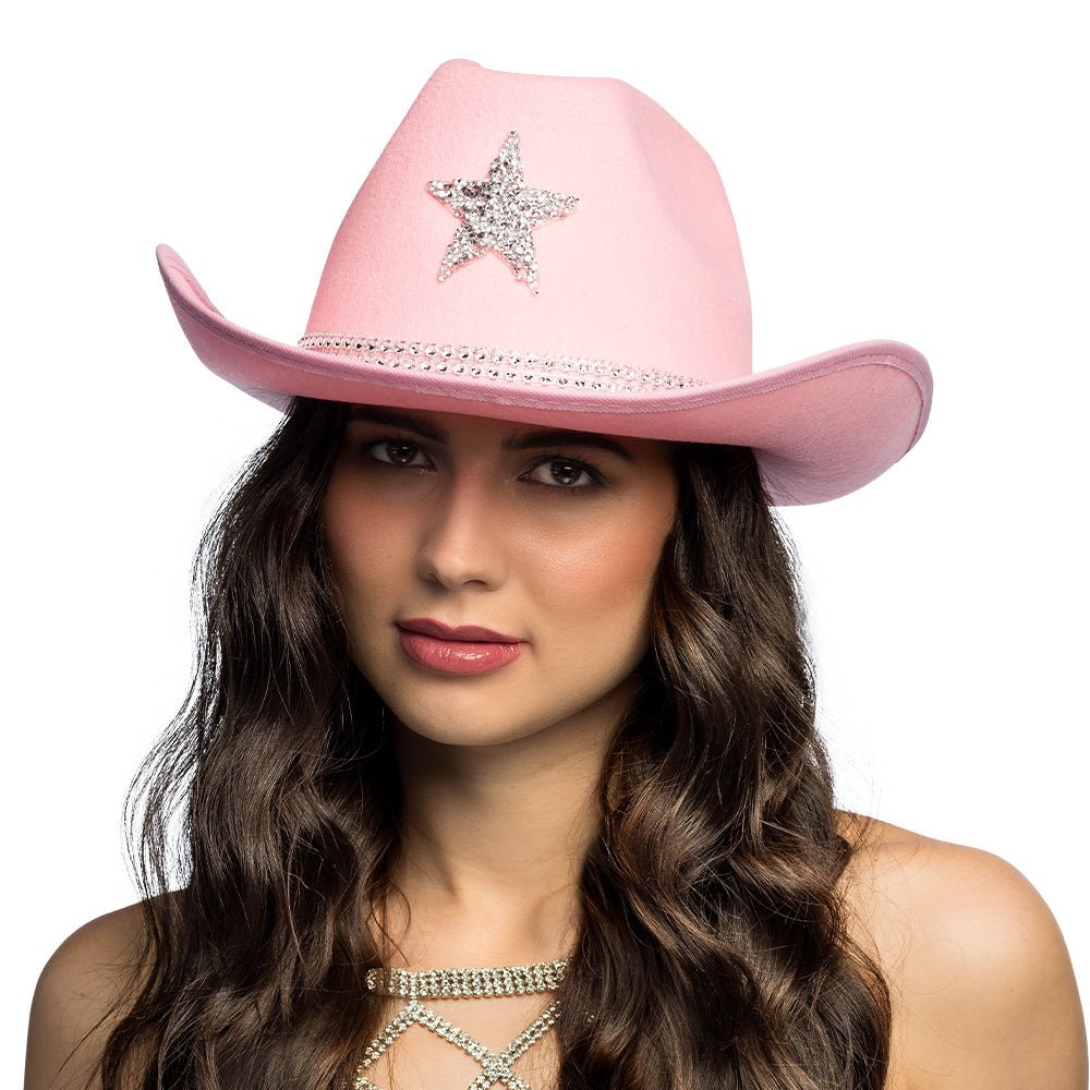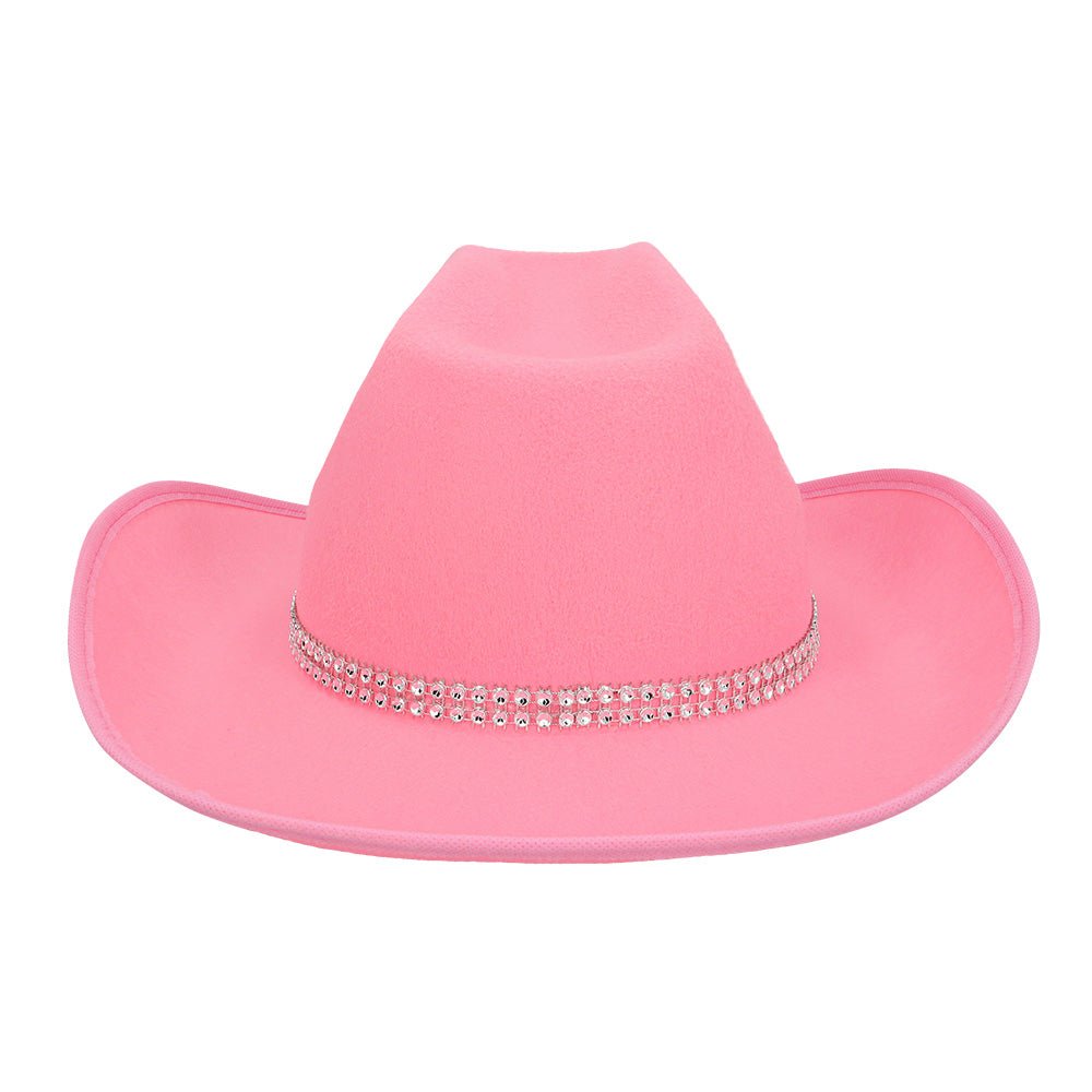 Met deze roze cowboyhoed breng je meteen kleur en glamour in je outfit! De opvallende zilveren strassster en de glinsterende strassrand geven de hoed een chique en feestelijke uitstraling. Perfect voor themafeesten, carnaval, festivals of gewoon om te stralen als cowgirl met stijl.