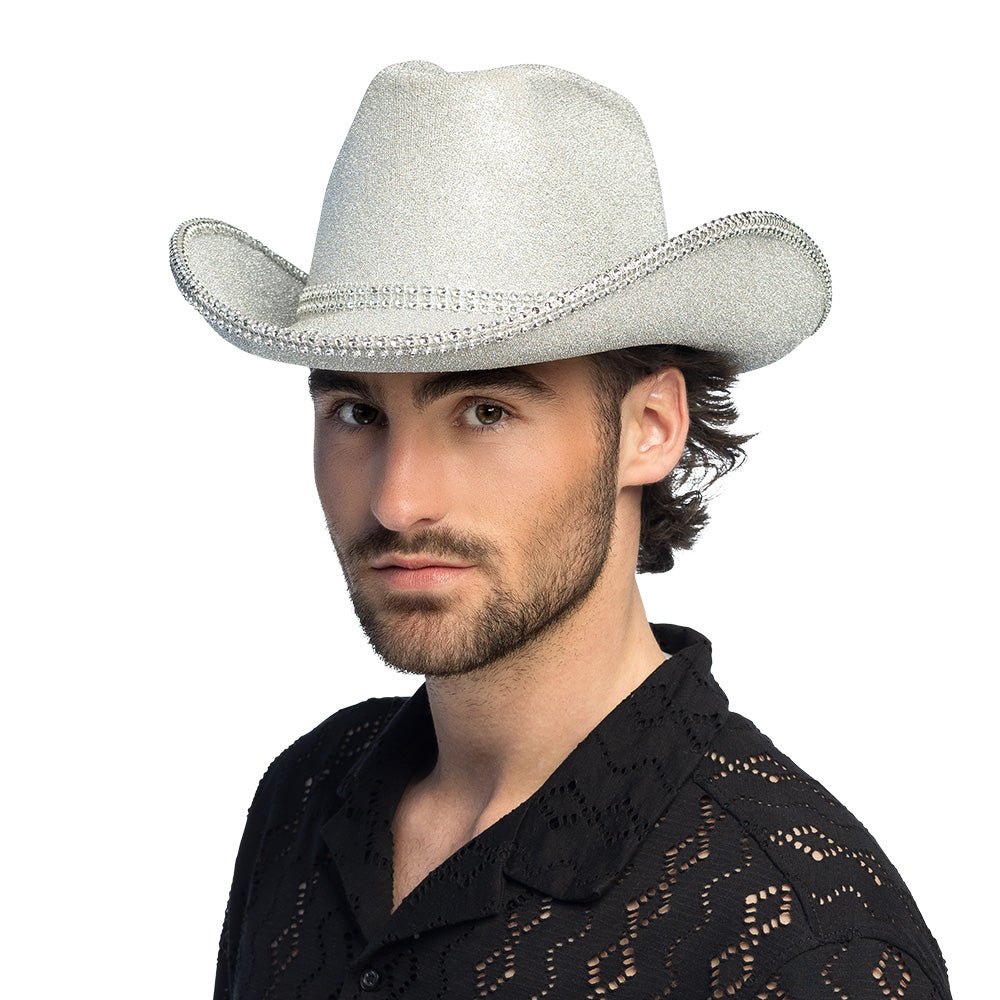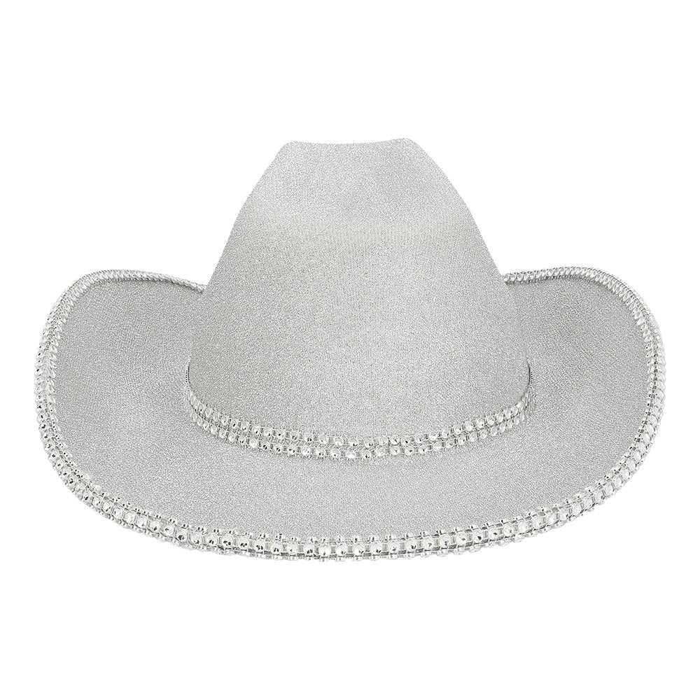 Steel de show met deze zilveren glitter cowboyhoed! De sprankelende zilverkleurige afwerking en de fonkelende strassrand langs de rand geven jouw look een chique en feestelijke uitstraling. Perfect voor themafeesten, festivals, carnaval of gewoon wanneer je wilt schitteren.