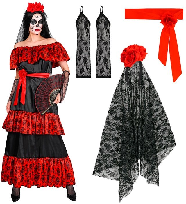 Vier de kleurrijke en feestelijke “Día de los Muertos” met dit complete dameskostuum. Perfect voor Halloween, themafeesten of culturele evenementen.