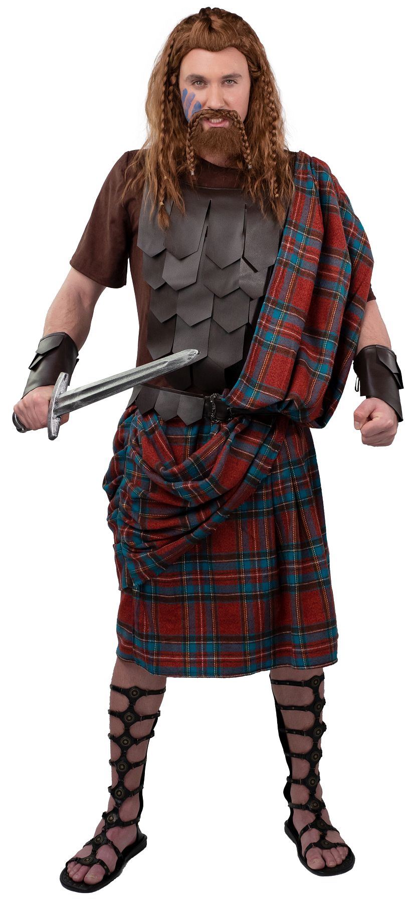 Dit Deluxe Highlander kostuum bestaat uit vier delen: een shirt, een rok met sash en twee armband-gaiters. Een compleet verkleed- of themakostuum.