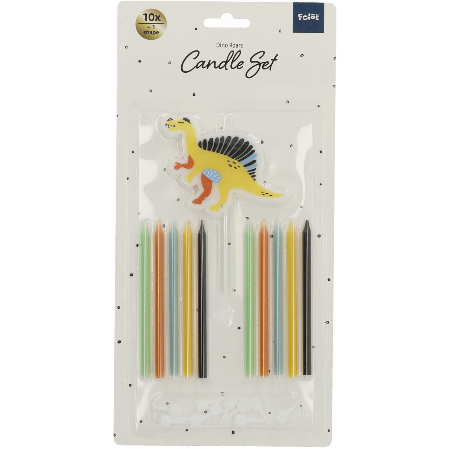 Kaarsen Dino Roars 10cm - 11 stuks. Inhoud: 11 kaarsen en 10 kaarsenhouders. Kleur: Meerkleurig. Bijvoorbeeld te gebruiken tijdens de volgende feestgelegenheid/feestgelegenheden: Kinderfeestje. Elke kaars is 10 cm lang. Het artikel is gemaakt van wax.