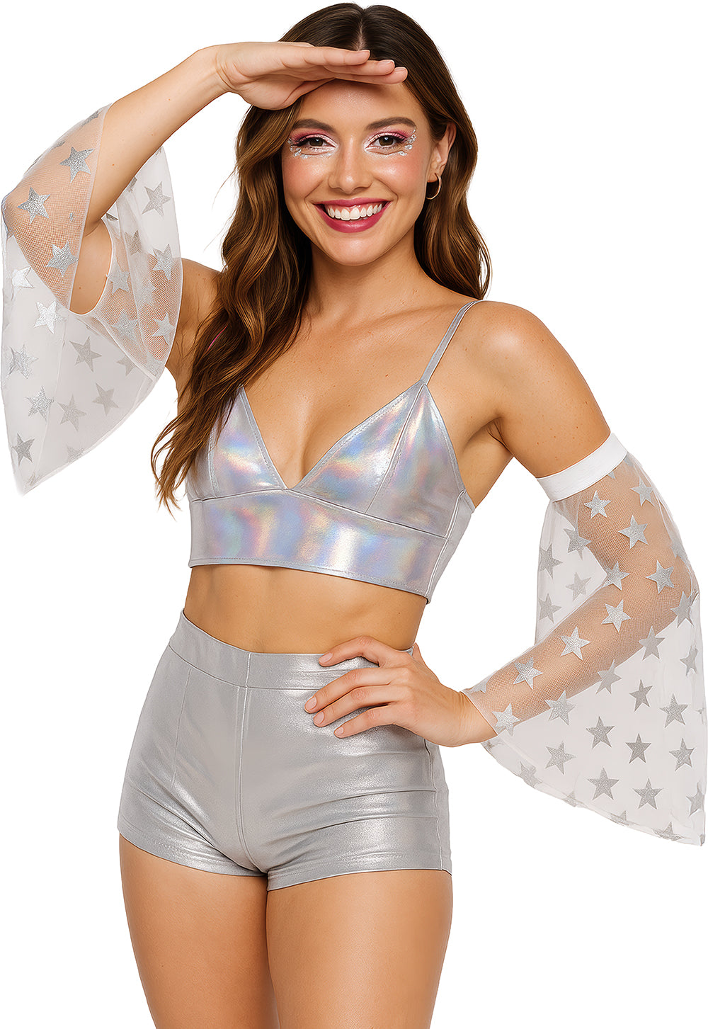 Geef je outfit een echte jaren 70-disco uitstraling met deze vlindermouwen met zilveren sterren. Perfect voor carnaval, themafeesten en disco-avonden.