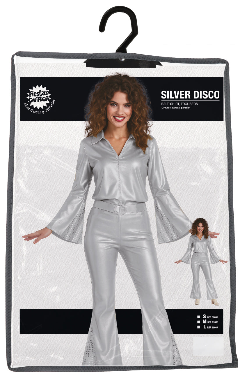 Bestaat uit een riem, shirt en broek: een complete 3-delige disco-outfit.
