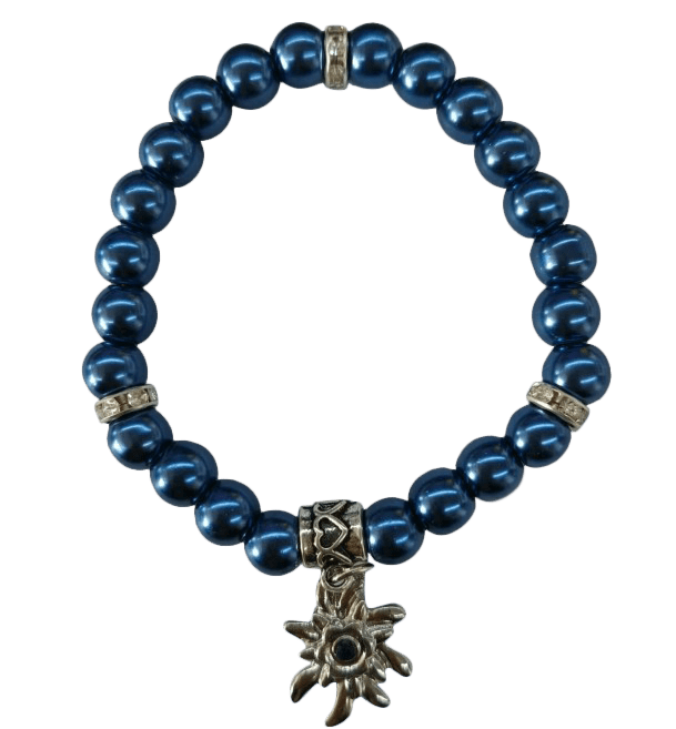 Voeg een elegant accent toe aan iedere outfit met deze donkerblauwe armband met parels en edelweiss. Het stijlvolle ontwerp maakt de armband geschikt voor dagelijks gebruik of als bijzonder cadeau.