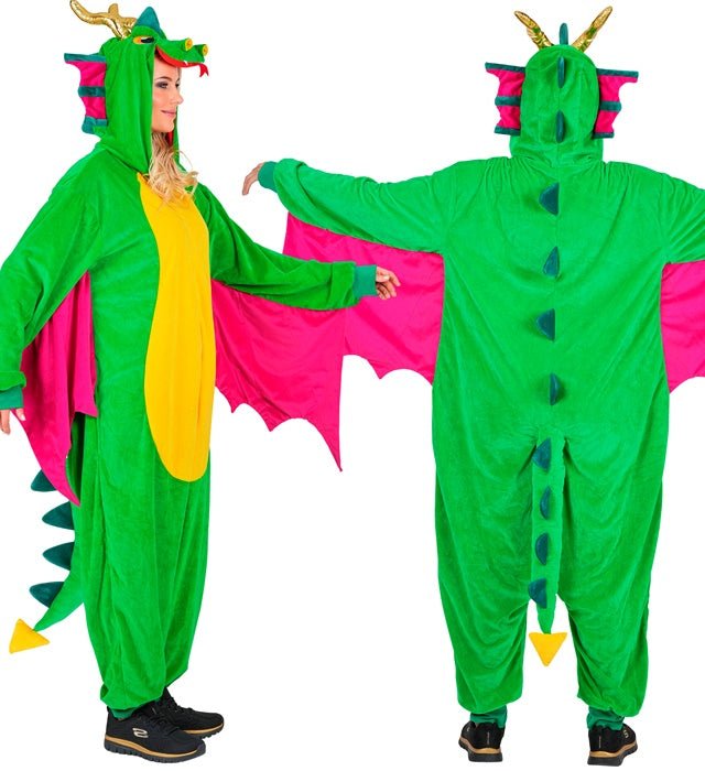 Dit draak-pluche jumpsuit met kap en masker is een compleet verkleedkostuum voor themafeesten of cosplay.