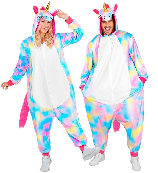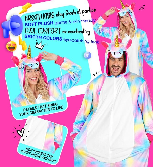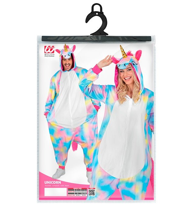 Dit eenhoorn-jumpsuit met kap is een compleet verkleedkostuum voor themafeesten of cosplay.