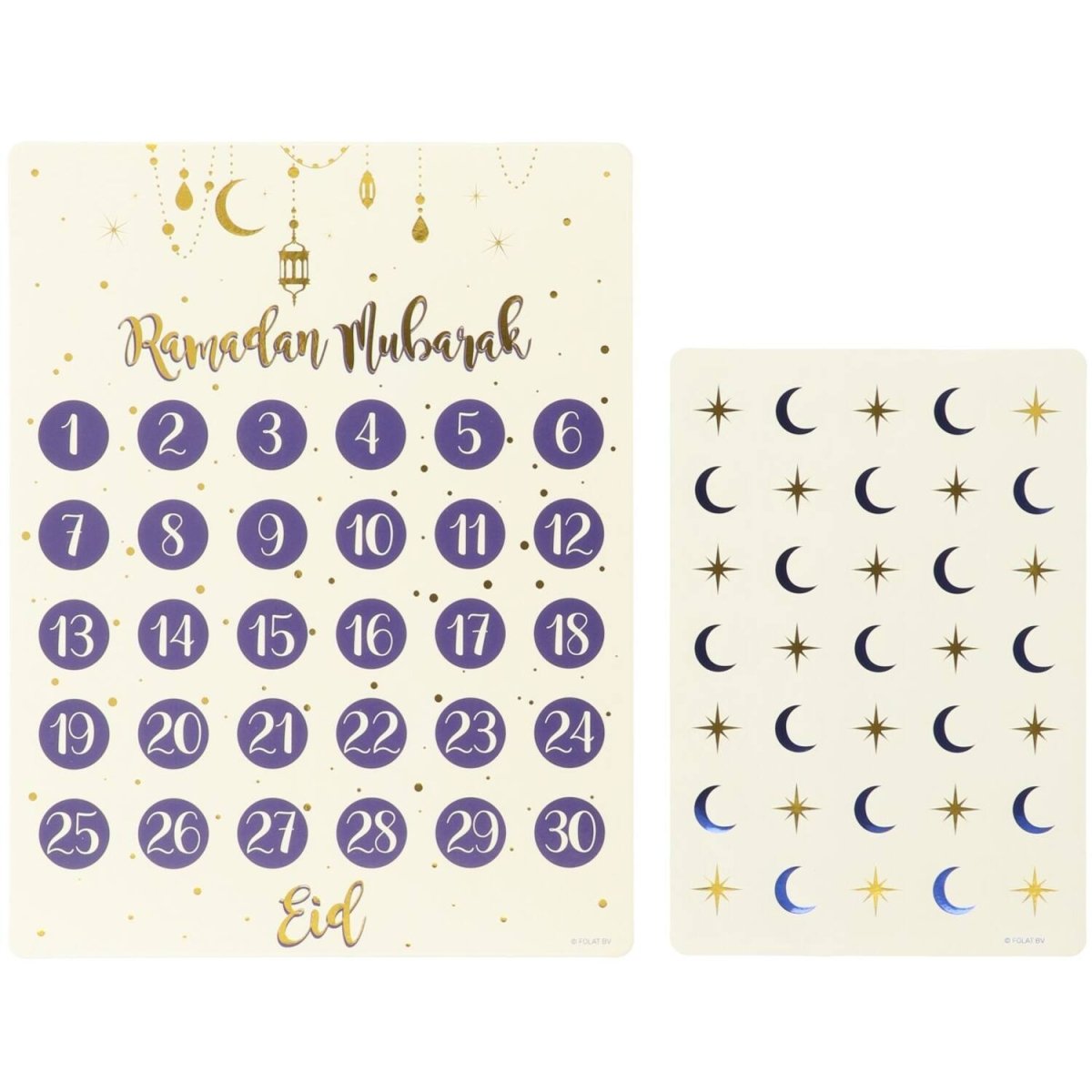 Een fijne ramadan. Aftelkalender 'Ramadan Mubarak', Eid Mubarak. Inhoud: 1 aftelkalander en 1 stickervel. Bijvoorbeeld te gebruiken tijdens de volgende feestgelegenheid/feestgelegenheden: Eid Mubarak. Door op deze aftelkalender elke dag een sticker te plakken wordt er afgeteld naar Eid al-Fitr, het feest aan het einde van de vastentijd (ramadan). De kalender is 18 x 23,5 cm en het stickervel is 12 x 17,5 cm. Ze zijn beiden eenzijdig bedrukt (hot stamping) en zitten samen in 1 verpakking. De stickers hebben een gouden en donkerblauwe folie bedrukking. Dit artikel is gemaakt van papier.