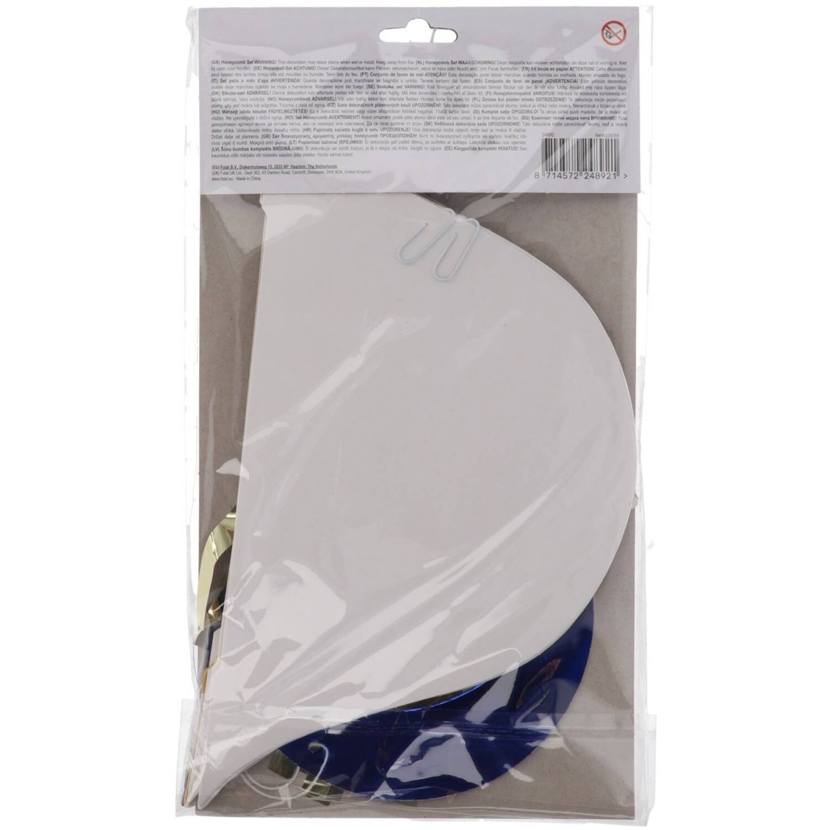 Maak het feest nog magischer. Honeycomb Set, Eid Mubarak, 3 stuks. Inhoud: 3 honeycombs. Bijvoorbeeld te gebruiken tijdens de volgende feestgelegenheid/feestgelegenheden: Eid Mubarak, Themafeest. Een prachtige honeycomb decoratie set met hangers: een gouden bol met een donkerblauwe maan, een donkerblauwe diamant met een gouden fringe tassel en een witte bol met een gouden olielamp. De honeycombs zijn gemaakt van papier en volledig gekleurd. De hangers zijn van dubbelzijdig geprint metallic papier. Deze betoverende decoratie is geschikt voor allerlei stijlvolle feesten. Dit artikel is gemaakt van papier en plastic.