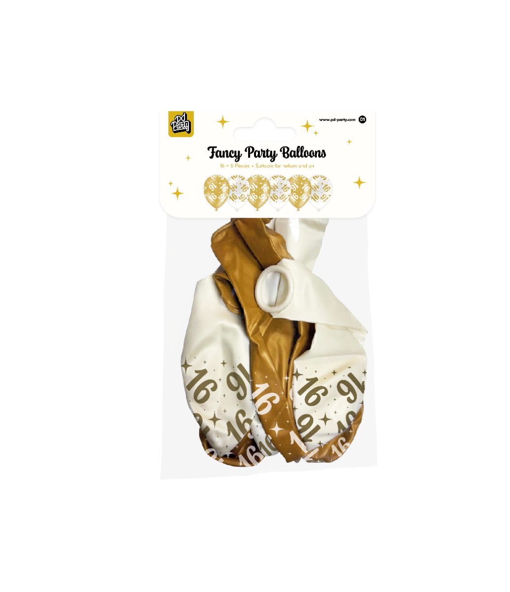 De Fancy Party Balloons - 16 van Paper Dreams zijn een stijlvolle toevoeging voor elk feest. Deze goud/witte ballonnen met opdruk "16" zijn gemaakt van hoogwaardig latex en hebben door hun luxe uitstraling een echte blikvangerstatus.