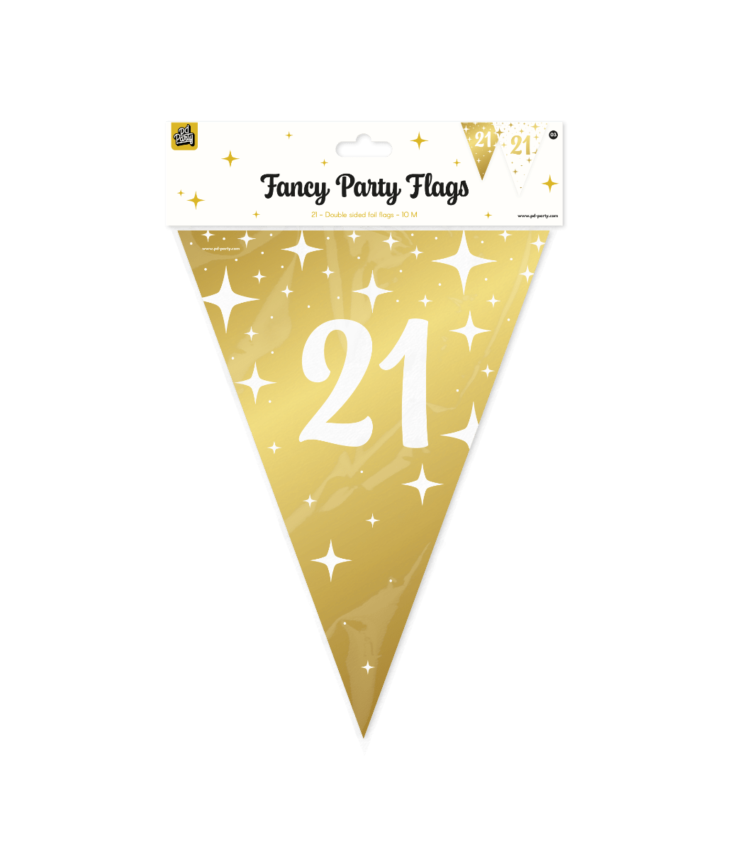 De Fancy Party Flags foil - 21 laat zich uitstekend combineren met onze bijpassende ballonnen én met andere feestartikelen uit ons ruime assortiment, zodat je moeiteloos een feestelijke en stijlvolle sfeer creëert.