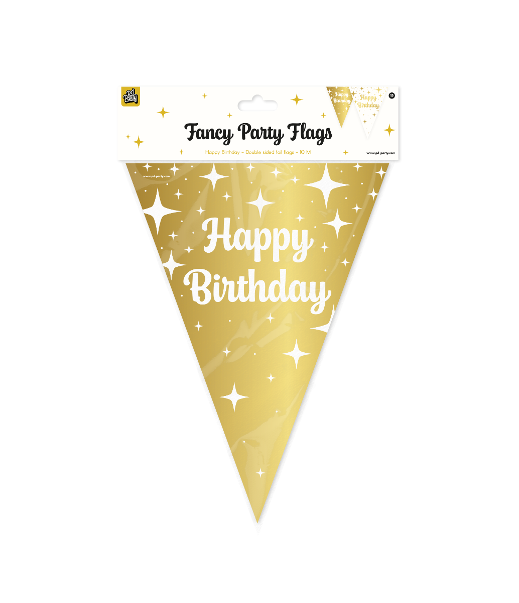 De Fancy Party Flags foil - Happy birthday laat zich uitstekend combineren met onze bijpassende ballonnen én met andere feestartikelen uit ons ruime assortiment, zodat je moeiteloos een feestelijke en stijlvolle sfeer creëert.