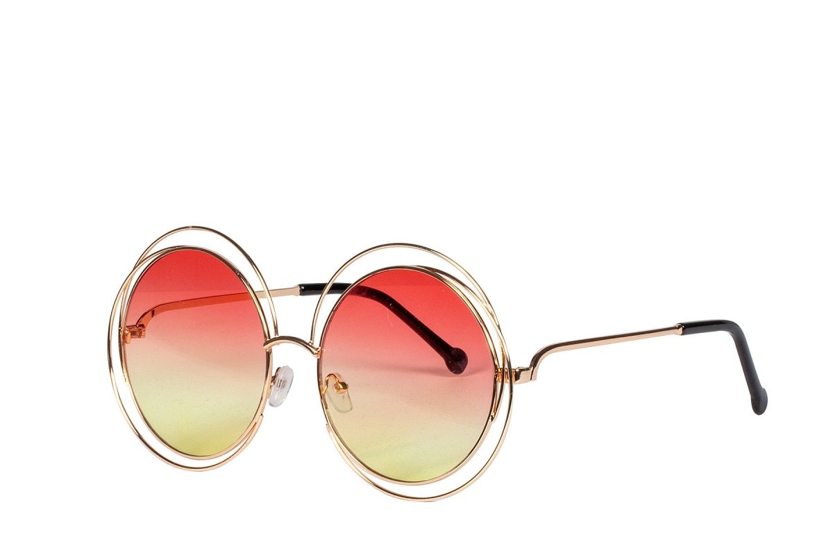 Ronde festivalbril met gele en rode glazen. Perfect als accessoire voor festivals, themafeesten of verkleedoutfits.