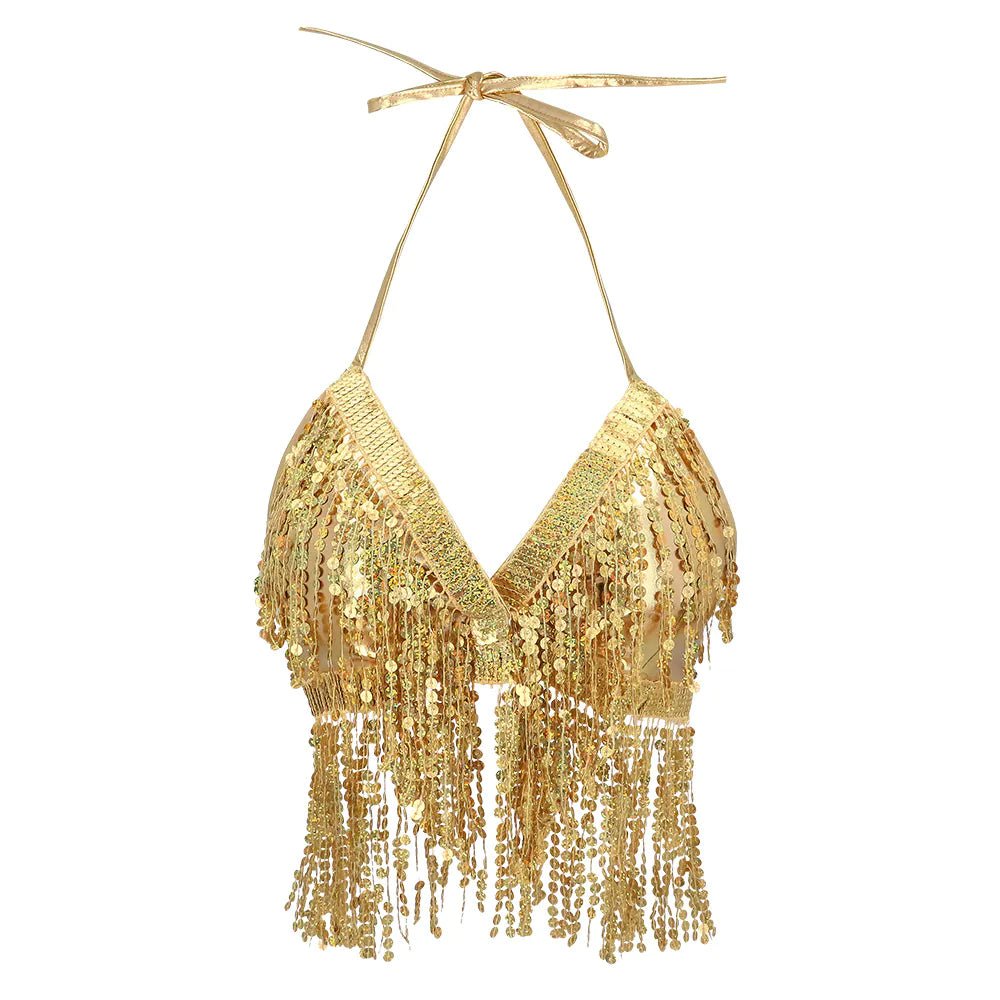 Deze gouden shiny top met franjes straalt pure glamour uit en is perfect voor wie echt wil opvallen. In een handomdraai creëer je een festival-look met een onmiskenbare wow-factor. Maar deze top is ook te gek voor een 1001 nacht themafeest of wanneer je bijvoorbeeld verkleed wilt gaan als buikdanseres tijdens carnaval.